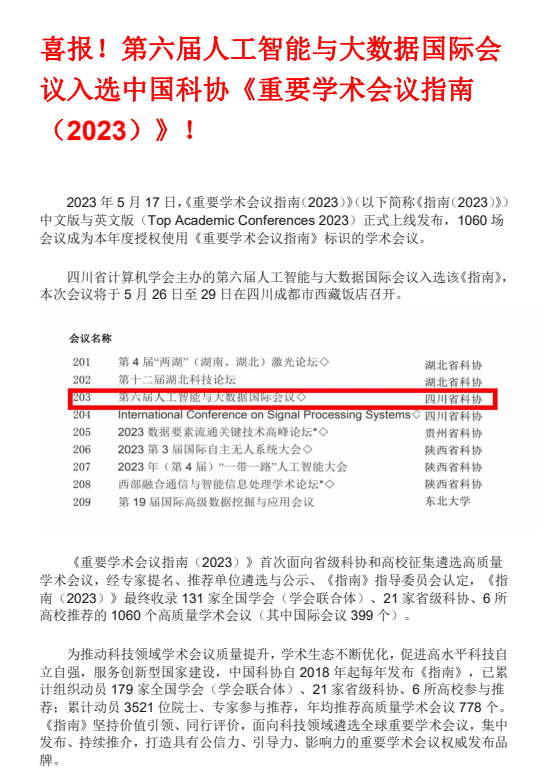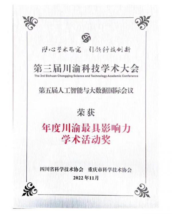 四川省计算机学会主办的“人工智能与大数据国际会议(ICAIBD)”,已成为一个知名国际会议。ICAIBD 2020-2022已连续三年被授予“川渝年度最具影响力的十大学术活动”之一 ,并在连续三年在川渝科学技术大会上受到表彰。2023-2024年,人工智能与大数据国际会议入选中国科协《重要葡京网投app_澳门葡京游戏-【在线*平台】指南》。